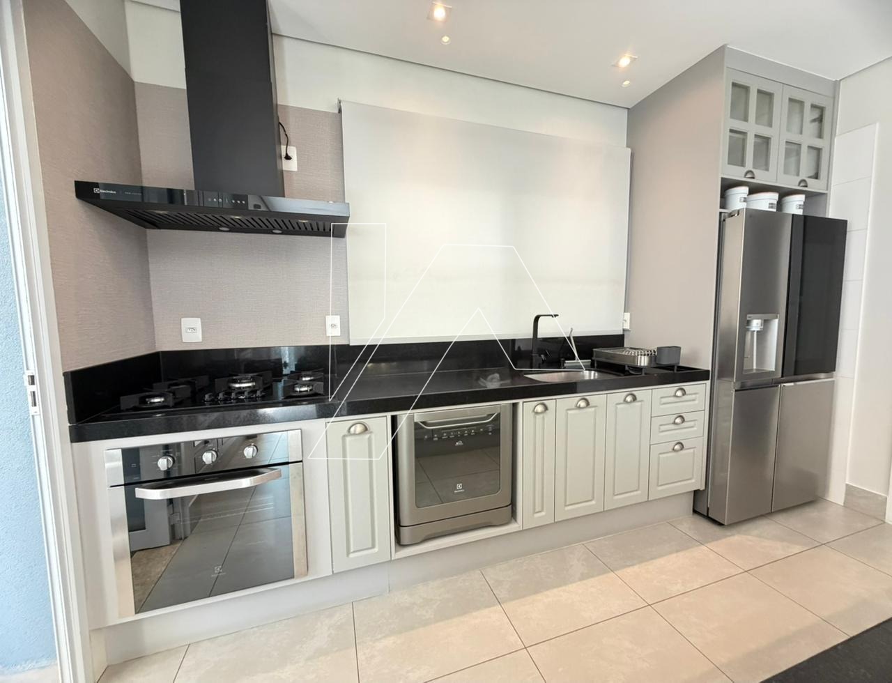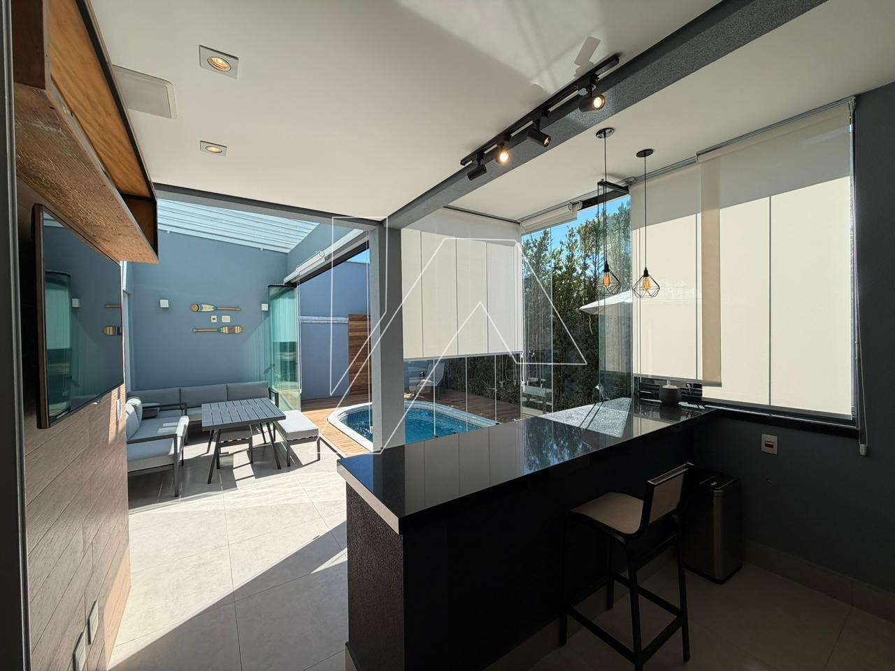 . Área gourmet toda fechada em vidro e persianas rolo.